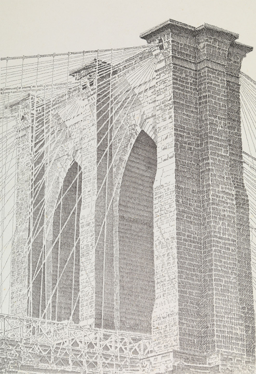 The 19th century may have been the heyday for pen and ink drawing, but the sum of Jack’s crosshatches and stipples is as vital and intriguing as work in any medium used today to capture Amrica’s greatest city. Soft enough to be mistaken for engraved aluminum or pencil work, his cityscapes can initially trick the eye with the illusion of simplicity. The subtle genius of such muted tones is that they repay the most cursory glance with an invitation to look deeper. Mood is palpable in his drawings. The mix of loneliness and serenity permeating Jack’s nocturnes, particularly the Manhattan Bridge as seen from Brooklyn, is arresting and evokes the urban lithography of Stow Wengenroth.