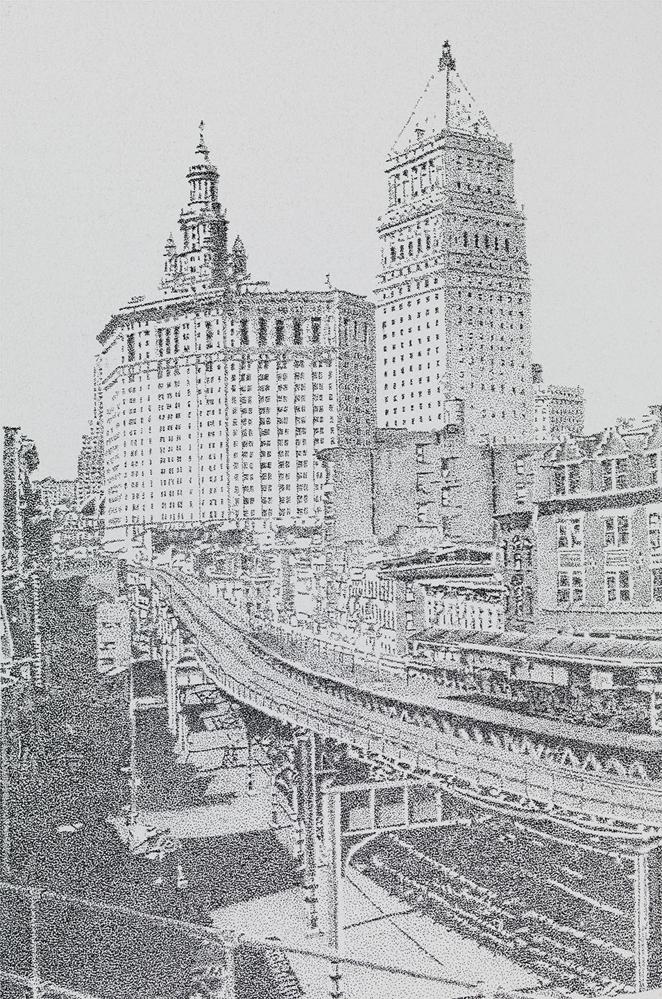 Jack tends to deflect praise for his ability to capture the noirish qualities of that bridge and other city structures by describing his reconnoitering escapades with self-deprecating wit. He said that once, as a kid, after clambering up the ladders and stairs in one of the Manhattan Bridge’s steel towers all the way to the top, he and a friend actually dozed off between the giant finials. They each received the sunburn of their lives, albeit on only half their faces. They walked back home looking like black-and-white cookies.