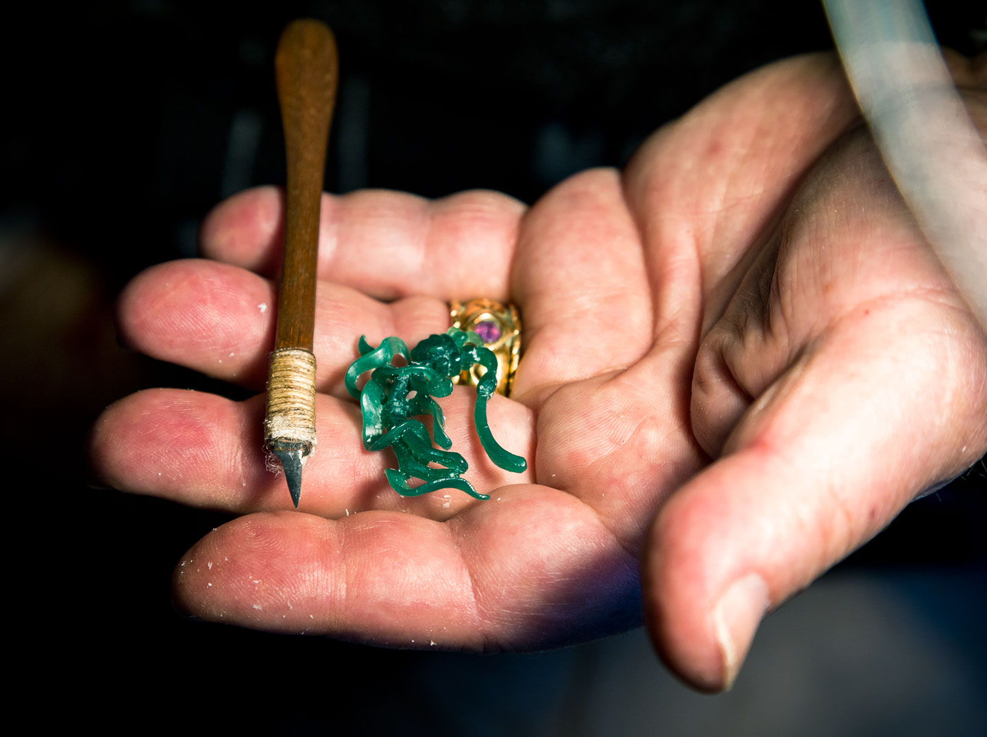 The part that is new and different is that Silverman does all this while engaging in psychotherapy sessions with patients. His clients sit opposite him in a comfortable chair. A client talks. The chess table between them is strewn with jewelry in various stages of completion. Figures of orchids cast in various precious metals predominate. He slices intricate designs into a small lump of bright green wax while conversing or comforting his clients. The wax figures will later be used to create molds into which precious metals will be poured.
