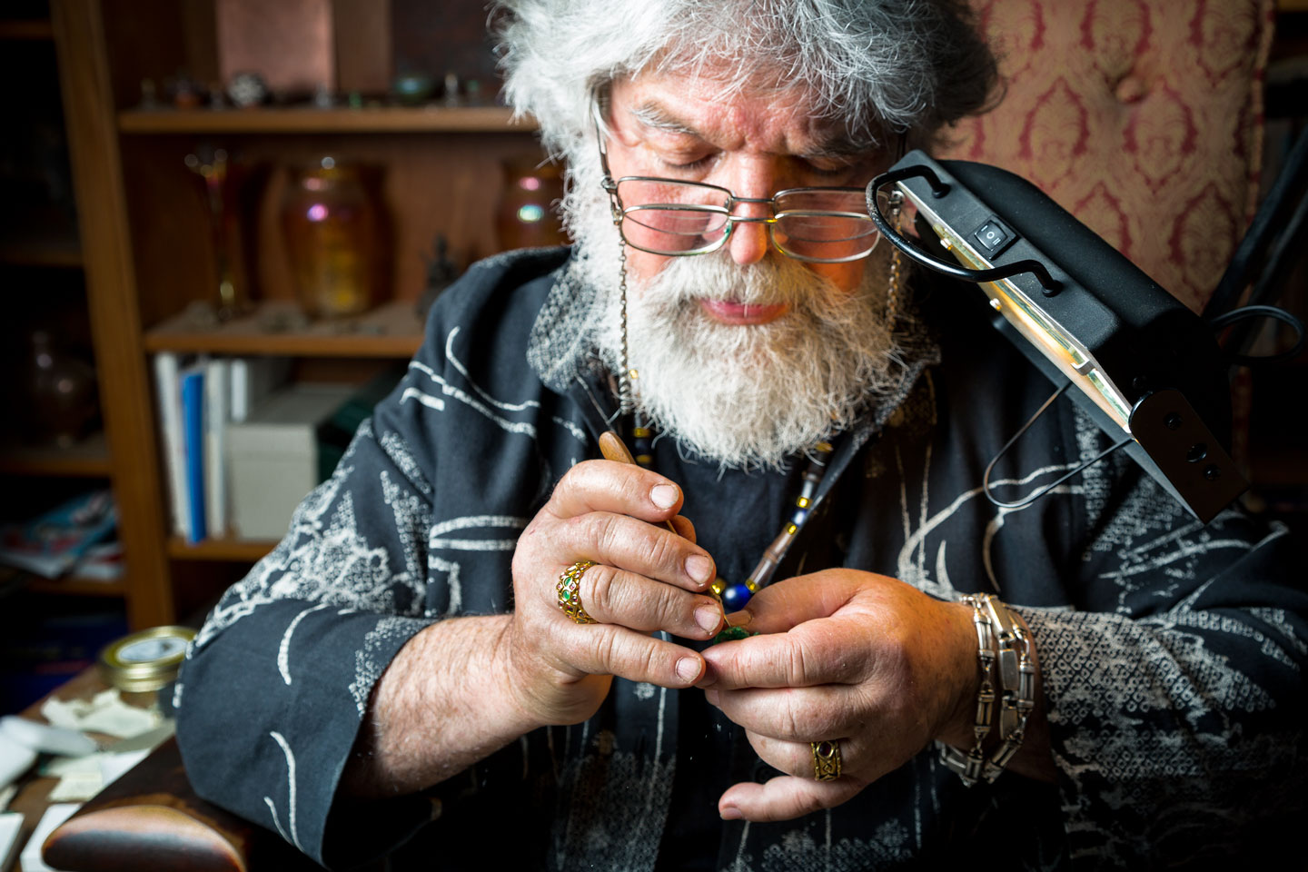 Mostly, his in-session jewelry work provides a relaxing atmosphere for client and psychotherapist alike. “It’s very slow and meticulous work,” Silverman says. “It keeps me calm and focused. And they’re not self-conscious. They don’t have to be looking at me all the time.” And, because many of his clients are artists, it creates a bond between him and the people he serves. “I’m an example of someone who works slowly and persistently at something,” he explains, “even though the financial rewards are nil. I spend more on my art than my art spends on me.”
