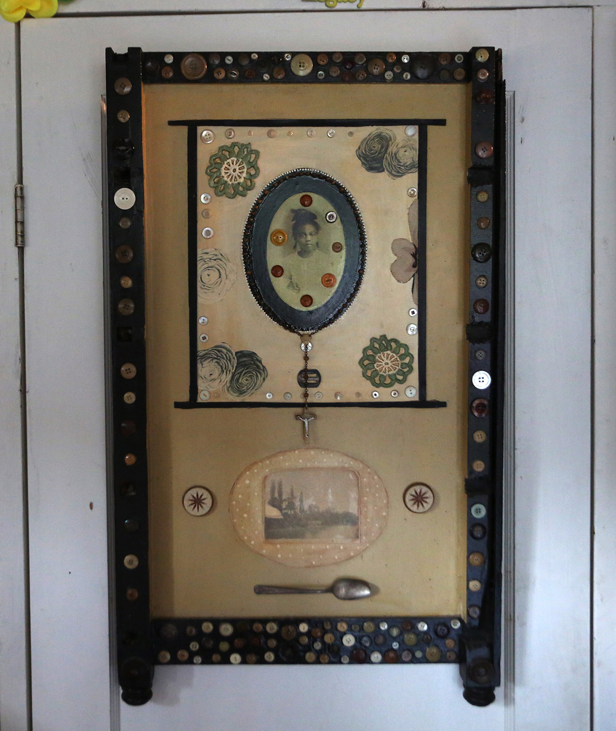 Now, more than twenty years later, Stovall’s assemblages have a large and loyal following on the Vineyard and elsewhere. Her pieces are soulful and spiritual, sometimes political, and often historical, exploring both her own personal journey and the journeys of others. “Found objects have energy in them,” she says. “I have to be very respectful of images and other things I use in my work, because they’re part of the histories of living people.” The daughter of the civil rights pioneer and newswoman Charlayne Hunter-Gault, Stovall frequently incorporates themes from the African-American experience into her work. “I’m like a refractive lens,” she says. “My work is a reflection of what I’m seeing.”